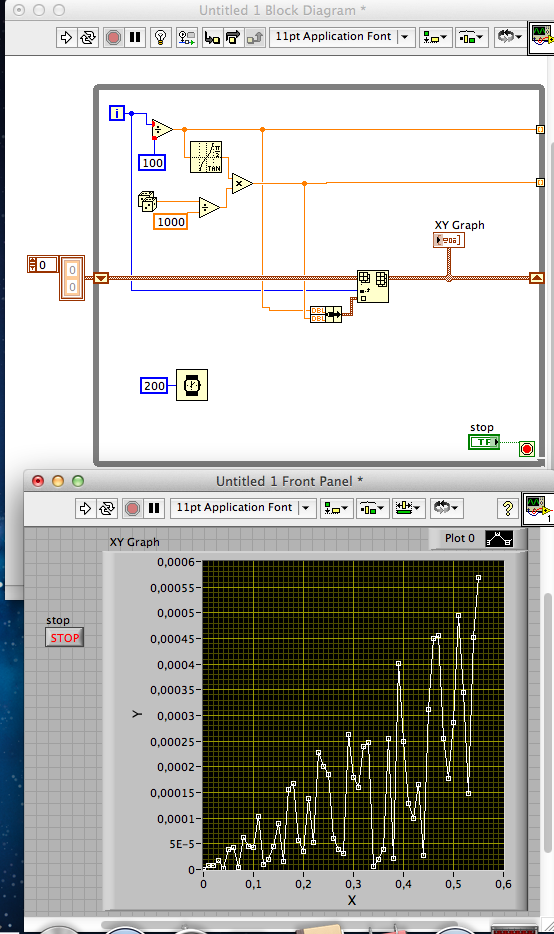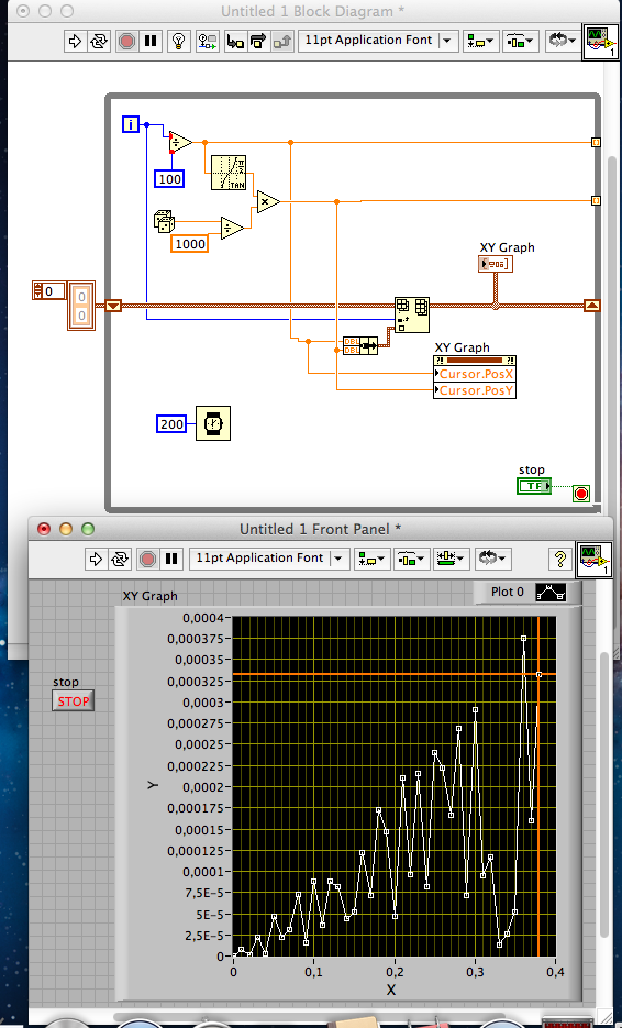 Разберем ка сделать XY курсор на простом примере. Программа строит на графике значения тангенса, и, для интереса, я вставил RND. Если же вы прописываете набор ВАХ или R(T), то зачастую трудно отличить какой график сейчас строится, а какой был. Здесь нам в помощь может прийти курсор.